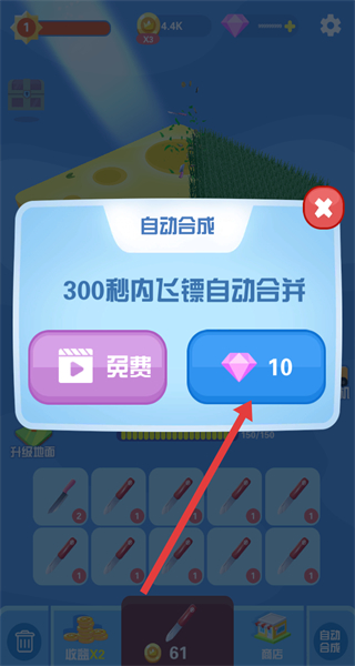 4、选择消耗10钻石,开启300秒内飞镖自动合并的功能,自动完成飞镖升级,提升割草效率。