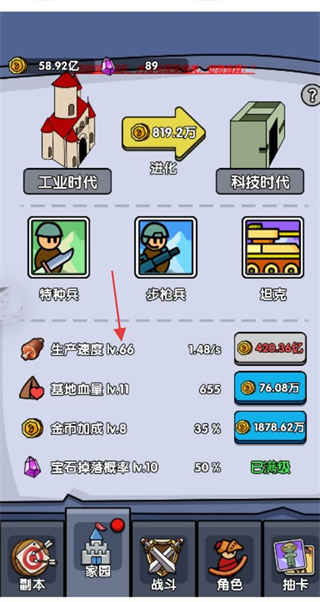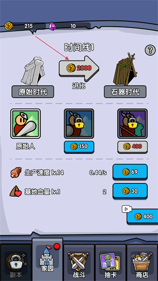 1、在家园界面,使用金币升级我们的文明水平,从原始时代升级到更高级时代,解锁更强兵种。