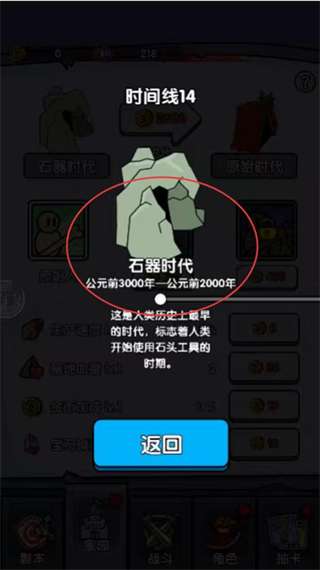 2、升级后会弹出时代介绍,点击返回继续游戏,提升生产速度等属性来实现强大的爆兵。