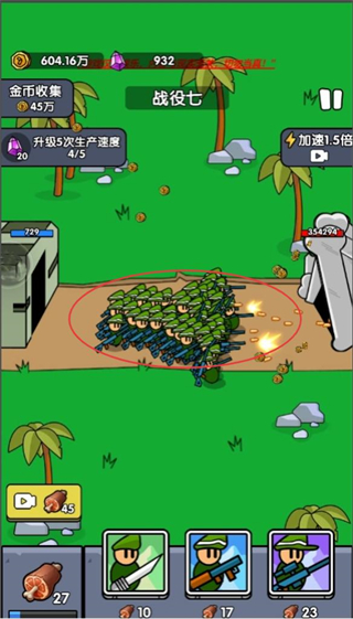 战斗中可依靠无限资源无间断召唤士兵,形成持续进攻态势,以数量优势消耗敌方战力,稳步推进攻占敌营的战斗进程。