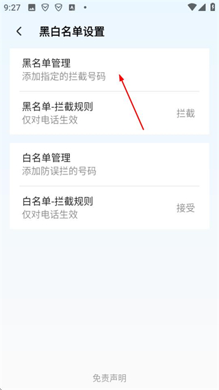 5、在黑白名单设置页面,点击黑名单管理选项,进入黑名单页面。