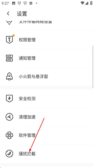 4、在骚扰拦截设置页面,点击黑白名单设置选项,进入黑白名单设置页面。
