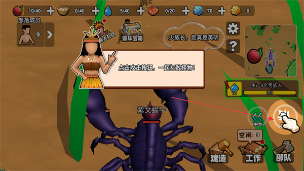 3、根据提示点击攻击按钮,指挥部落成员攻击紫文蝎子,发起战斗。