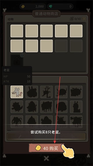 3、在动物商店中选择老鼠,消耗40金币点击购买,获取8只老鼠完成任务。