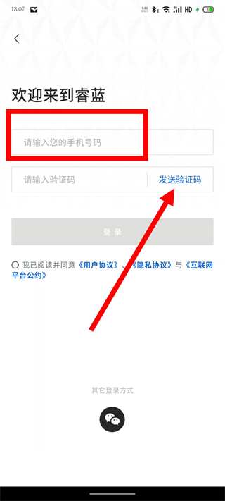 3、在登录页面,输入您的手机号码,点击发送验证码。
