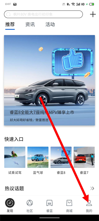 1、打开睿蓝汽车,点击底部的我的,进入我的页面。