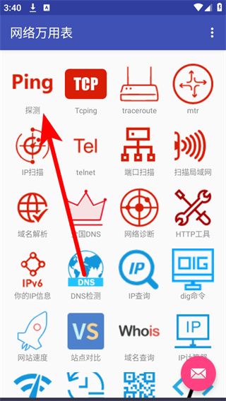 1、打开网络万用表APP,在首页功能区找到Ping探测,点击进入Ping探测页面。