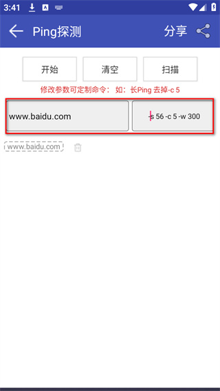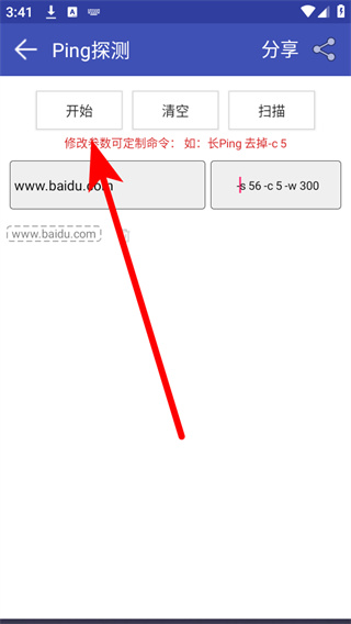 2、在Ping探测页面,在左侧输入框填写目标地址,右侧输入框可自定义Ping参数。