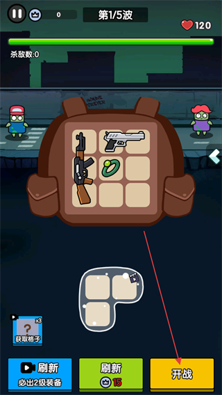 2、拖动下方的武器装备放置到背包内的格子中,点击刷新按钮可以刷新武器栏。