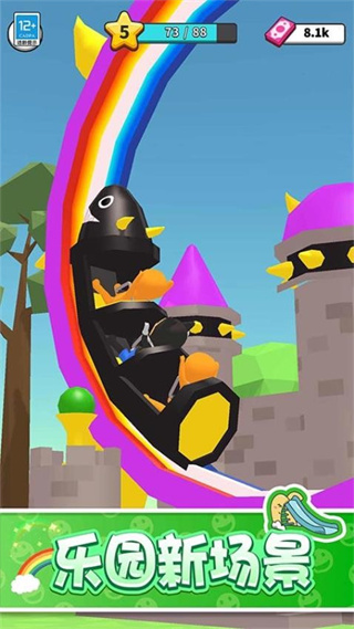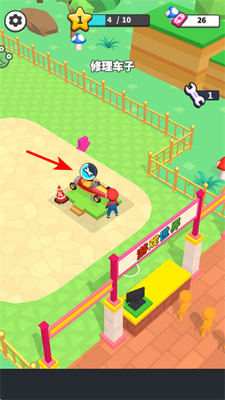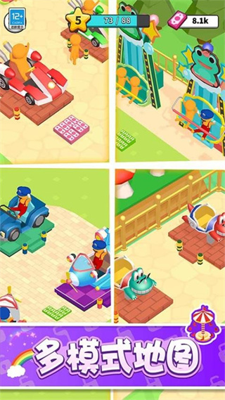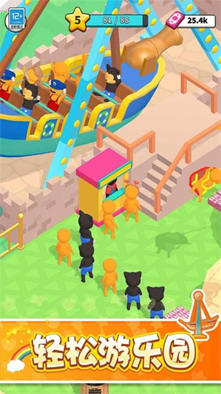 画面采用卡通化设计,场景风格独特且充满治愈感,从游乐设施到人物形象都色彩明快,搭配轻松愉快的背景音乐,营造出休闲放松的游戏氛围。