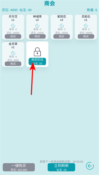 1、在商会界面,若现有购买栏位不足,可消耗仙玉解锁新栏位,扩展可购买道具的种类,为宗门储备更多资源如药材。