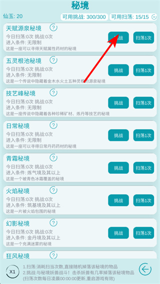2、进入秘境界面后,选择目标秘境如天赋源泉秘境,点击挑战按钮可进入秘境战斗,获取对应的秘境专属资源属性药材。