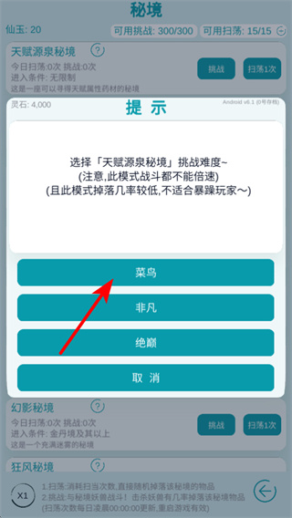3、挑战秘境时,先选择适合当前实力的难度如菜鸟,降低战斗难度,提升首次挑战的成功率,逐步积累秘境资源。