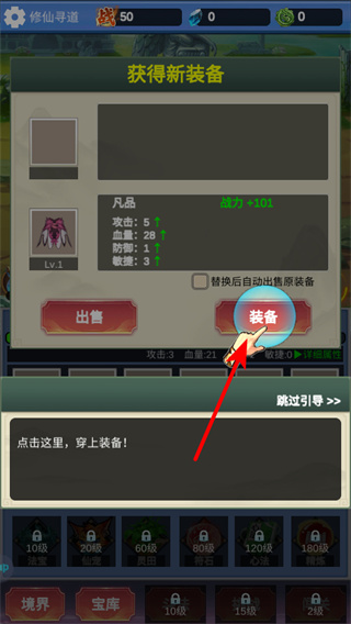 3、收妖后获得新装备时,点击装备按钮可穿戴该装备,提升自身的属性如气血、攻击,强化后续收妖、战斗的能力。
