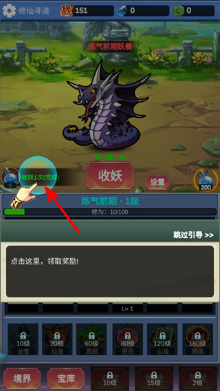 4、完成收妖操作后,点击界面中的奖励按钮可领取对应的收妖奖励,积累资源的同时,解锁更高等级的收妖目标。