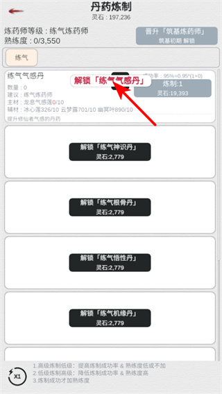 3、在丹药炼制界面,点击解锁按钮可开启对应丹药如练气气感丹的炼制权限,消耗灵石解锁后,使用对应材料炼制丹药,提升修仙属性。