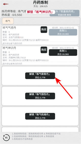 4、解锁新丹药如练气神识丹后,可通过消耗材料与灵石进行炼制,成功炼制丹药后,可服用提升自身的气感、神识等属性,强化修仙实力。