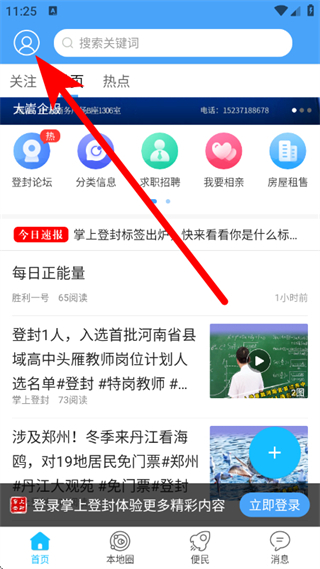 1、打开掌上登封,点击左上角的个人图标,进入我的页面。
