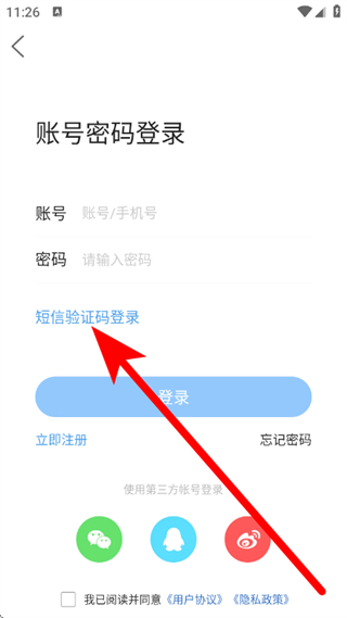 4、在账号密码登录页面,点击选择短信验证码登录,进入页面。