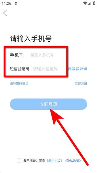 5、输入手机号和验证码,勾选协议后,点击立即登录,完成操作。