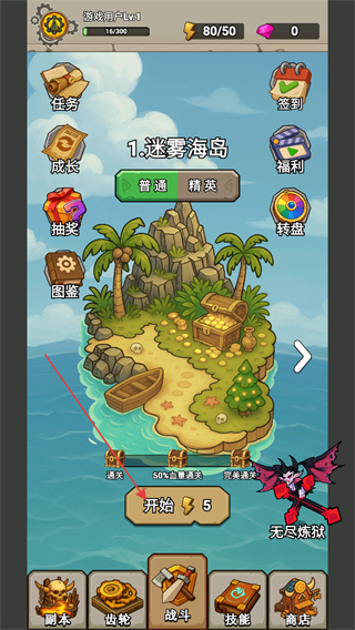 1、进入游戏主界面后,选择迷雾海岛的普通难度,点击界面下方的开始按钮进入关卡。