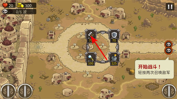 4、完成防御塔建造后,轻按两次敌军召唤按钮可触发波次进攻,观察防御塔的输出效果,敌军调整塔的布局或升级塔的等级。