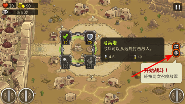 2、进入关卡后,选择战场中的建造位,消耗金币建造防御塔如弓兵塔,会自动攻击进入射程的敌军,是抵御进攻核心战力。