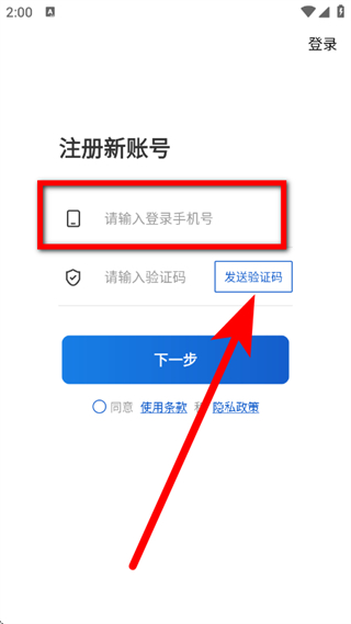 3、在注册页面,输入登录手机号,点击发送验证码。