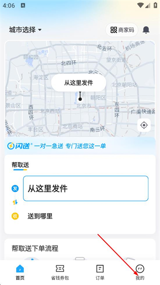 1、在闪送首页,点击底部的我的选项,即可进入个人页面。