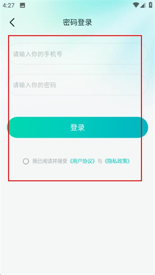 3、在密码登录页面,填写信息并勾选协议后,点击登录完成账号登录。