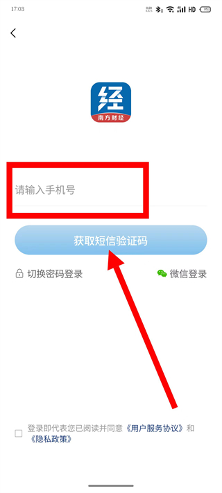 3、在登录界面,输入手机号,点击获取短信验证码。