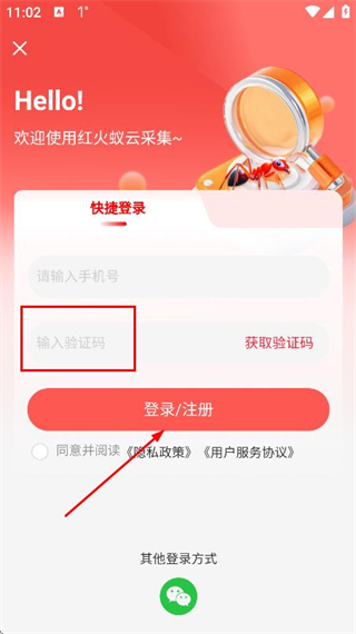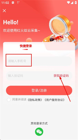 2、在手机登录页面填写手机号,勾选协议后,点击获取验证码。
