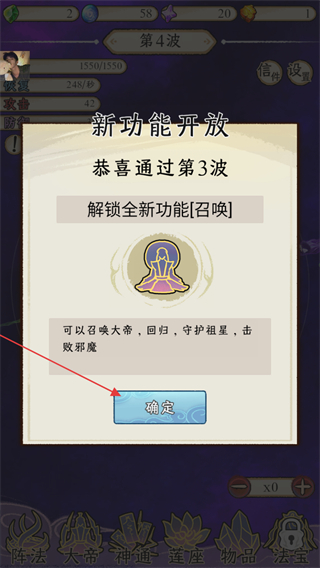 1、当通过第3波后,会弹出新功能开放的提示弹窗,该弹窗告知你解锁了全新功能召唤,此功能可召唤大帝回归守护星等击败邪魇。
