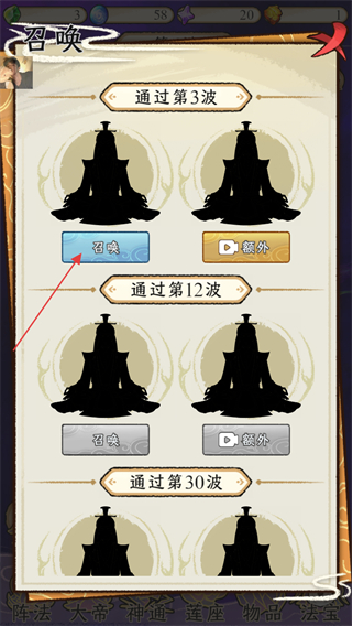 2、进入召唤界面后能看到不同解锁条件,通过第3波对应的可点击的召唤按钮,通过第12波、通过第30波对应的按钮暂未解锁,达成对应条件后可使用其功能。
