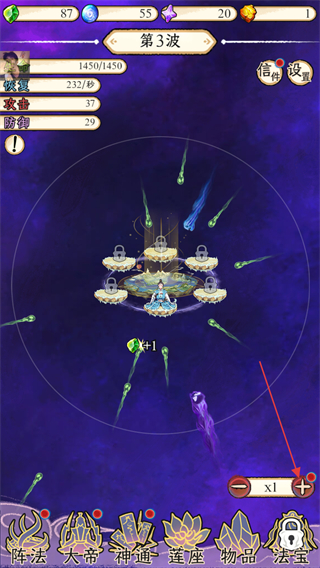 3、处于第3波的战斗界面时你能看到自身的恢复、攻击、防御属性数值,界面右下角有倍率调节区当前显示×1,点击旁的+可调整战斗倍率。