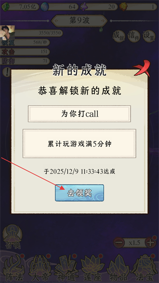 1、在游戏界面弹出新的成就提示,解锁的成就是为你打call,达成条件为累计玩游戏满5分钟,点击弹窗中的去领奖按钮可领取对应奖励。