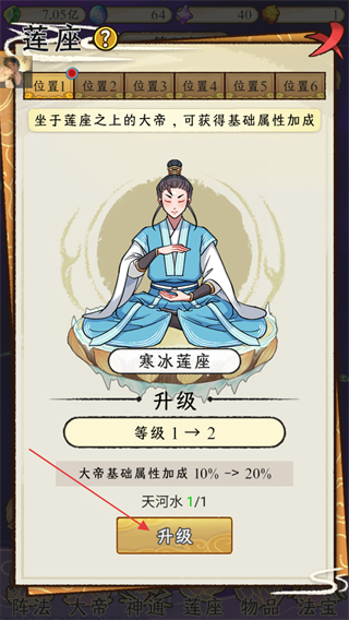 2、进入莲座界面后,寒冰莲座能为坐于其上的大帝加基础属性,当前可将等级从1→2,消耗天河水1/1,点击升级按钮提升属性加成比例。