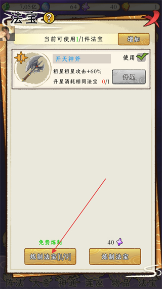 3、在法宝界面中,当前使用的法宝是开天神斧,可通过点击免费炼制对应的炼制法宝1/9按钮来炼制新的法宝。