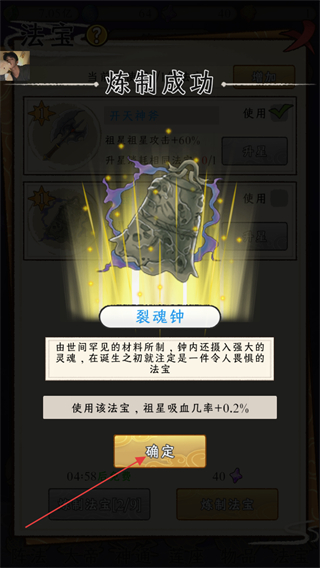 4、炼制法宝后出现炼制成功提示,获得的法宝是裂魂钟,其效果为祖星吸血几率+0.2%,点击确定按钮关闭该提示弹窗。