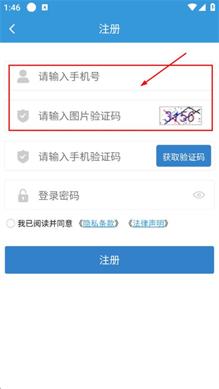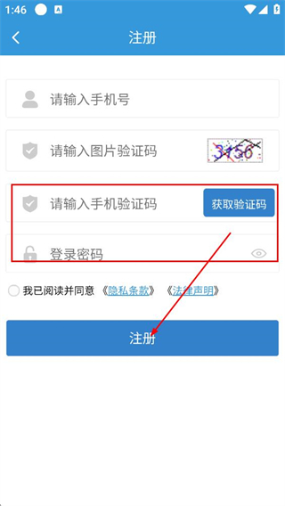 3、在注册页面,继续填写手机验证码与登录密码,点击注册,完成注册。