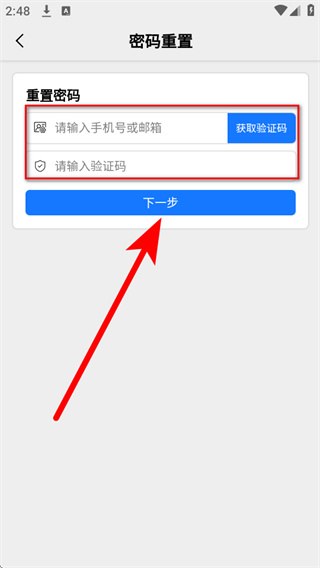 4、在密码重置页面,填写手机号或邮箱,点击获取验证码,将收到的验证码填入后点击下一步。