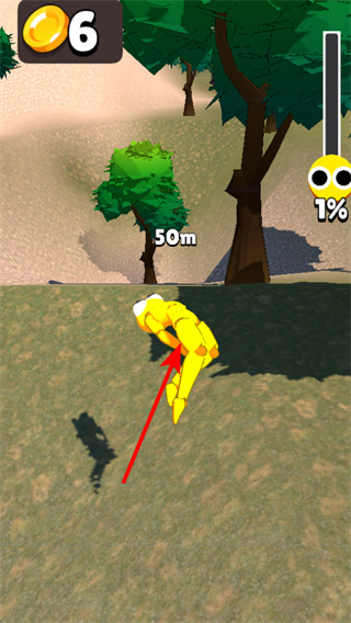 2、角色飞行过程中,留意场景内的距离标识与金币收集情况,通过持续操作控制角色的飞行轨迹,这是推进关卡进度的基础操作。