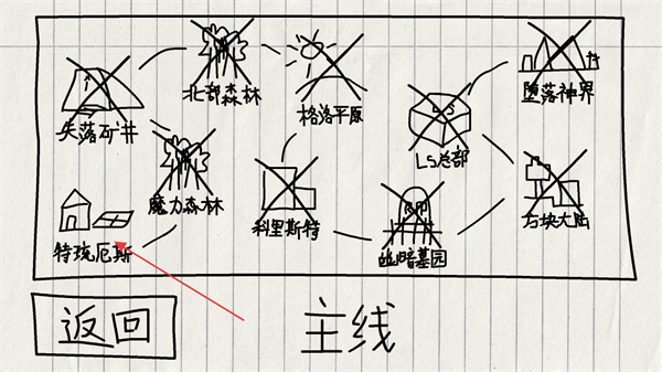 1、进入地图界面,看到失落矿井、北部森林等区域选项,点击特琉尼斯可进入该区域,界面底部还有返回按钮可供操作。