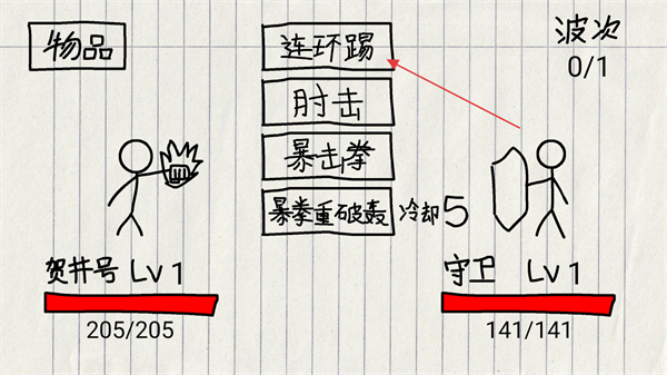3、进入战斗界面,角色贺井号Lv1对阵守卫Lv1,可选择连环踢等技能发动攻击,推进当前波次0/1的战斗进程。