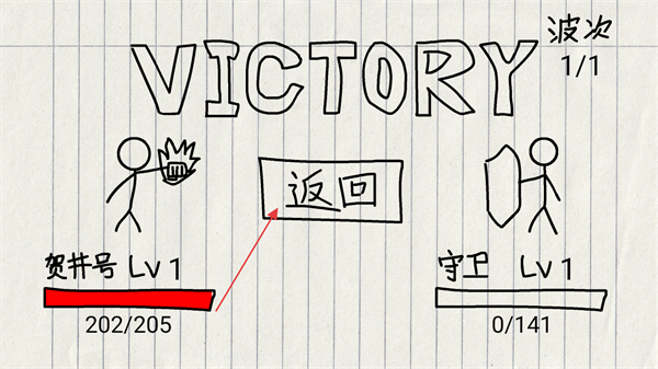 4、战斗胜利后界面显示VICTORY,守卫血量已清空,点击返回按钮即可回到之前的关卡选择界面。