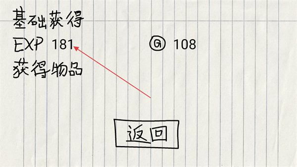 1、这是通关后的奖励界面,显示基础获得的EXP181与货币108,点击界面中的返回按钮,即可回到游戏主界面继续操作。