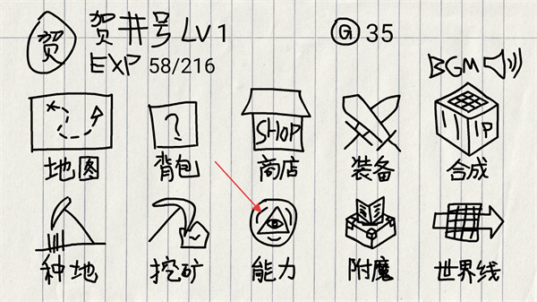 2、这是游戏主界面,通关获取的EXP经验值可以进行升级获得能力点数,点击能力按钮,可进入属性加点界面进行角色属性配置。