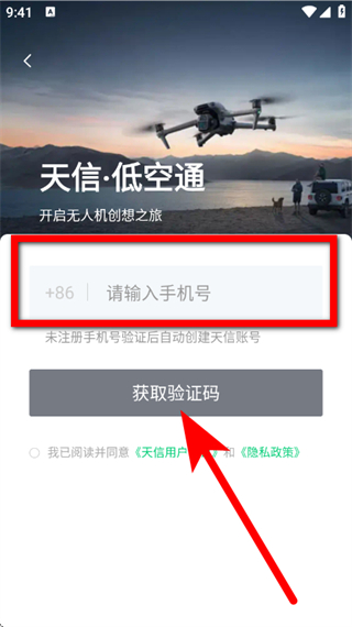 3、在登录页面,输入手机号,勾选协议后,点击获取验证码。