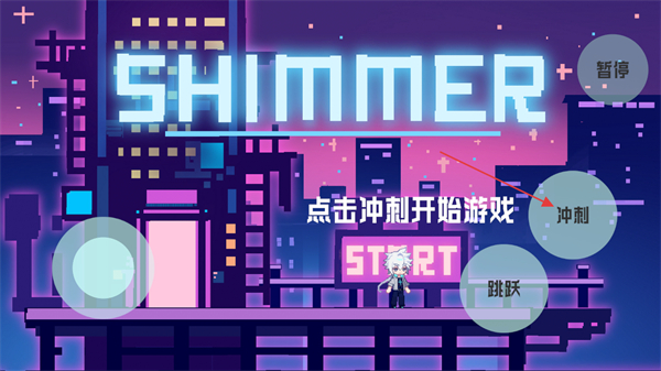 1、这是Shimmer的启动界面点击冲刺按钮开启游戏,右侧的按键是核心操作键,助力后续游玩。