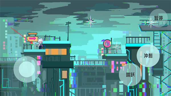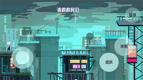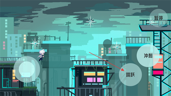3、在游戏进程中点击跳跃按钮可控制角色跳跃,以此跨越场景里的建筑障碍推进关卡的游玩进度。